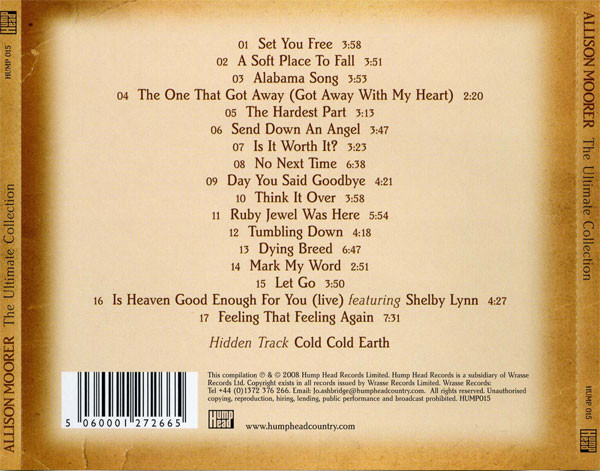 01. Set You Free 3:58 02. A Soft Place To Fall 3:51 03. Alabama Song 3:53 04. The One That Got Away (Got Away With My Heart) 2:20 05. The Hardest Part 3:13 06. Send Down An Angel 3:47 07. Is It Worth It? 3:23 08. No Next Time 6:38 09. Day You Said Goodbye 4:21 10. Think It Over 3:58 11. Ruby Jewel Was Here 5:54 12. Tumbling Down 4:18 13. Dying Breed 6:47 14. Mark My Word 2:51 15. Let Go 3:50 16. Is Heaven Good Enough For You (Live) (Feat. Shelby Lynne) 4:27 17. Feeling That Feeling Again 7:31 18. Cold Cold Earth Tento produkt zatím nikdo nehodnotil.